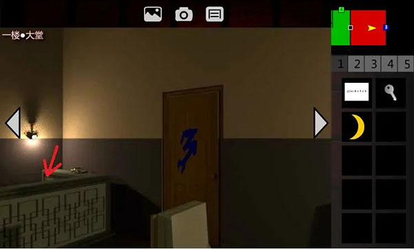 3、左转,点击柜台内侧,取走【纸团】。左转,取走柜台中间的【1号钥匙】。左转,出门。
