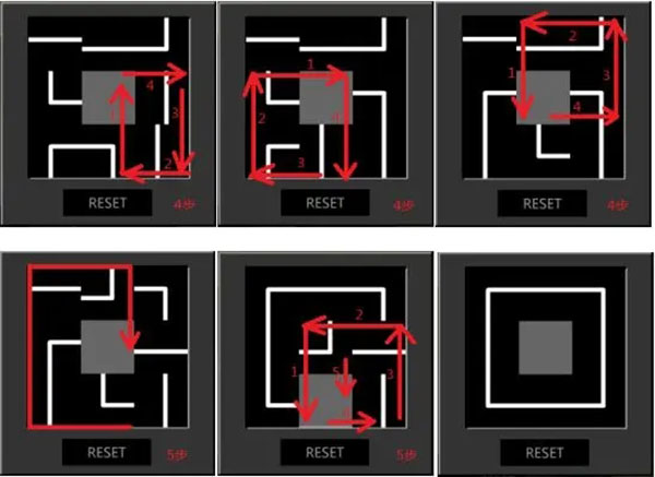 11、出门,进入5F•北侧廊。左转,上楼,触发剧情,左转3次,看到铁门左边的密码器。原理是三阶拼图。把拼图拼成白色的“口”。再点击一下打开,刷【临时门禁卡】,进入铁门。解法:完成每一部分,请保证你面前的拼图与下一部分重合。
