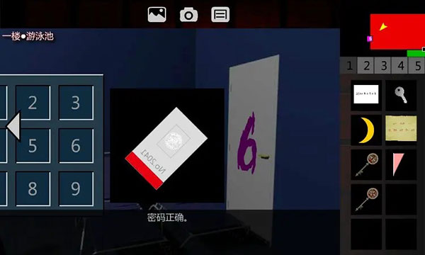 8、解开密码器,进入1F•厨房。右转2次、点击窗户、翻窗,进入1F•游泳池。右转,点击密码器,这是九宫格密码器,容易联想到电视机的字出现顺序。输入密码591274638(固定),取走【临时门禁卡】。回到1F•电梯间。