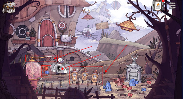 10、根据地上坑洞的牌子提示,调整鼹鼠仪器,点击对应的符号以及颜色,然后拉下拉杆,使所有坑洞都填上对应的鼹鼠。