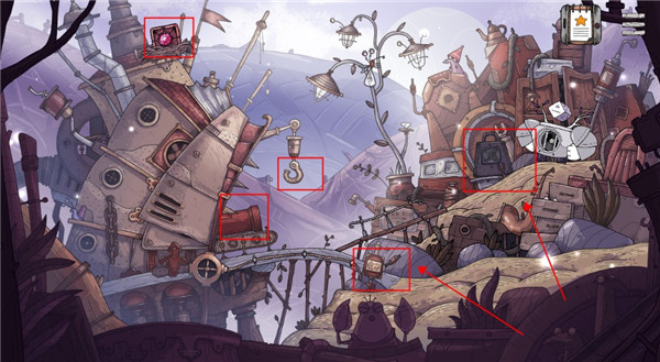 16、切换角色为机器人,利用【木板】搭桥,通过两个断层,分别拾取【玻璃碎片】、【红色书本】以及水壶上的【计量表】。