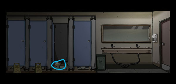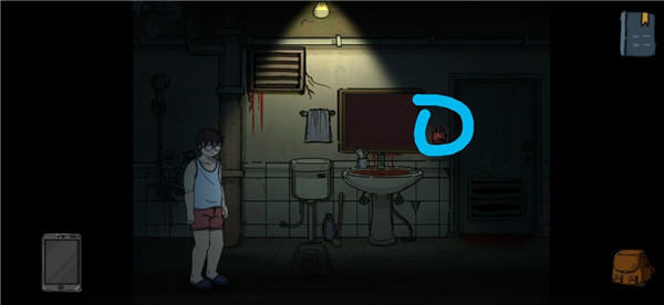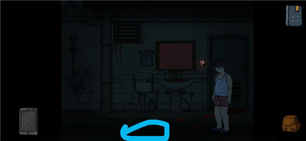 关灯以后地上一排血,顺着它走到厕所儿坑前面,也就是这个位置,前方低能。点击黑影提示黑色的影子看着便池下面。我们把灯打开,再摸一次图上圈的位置,获得[十字螺丝刀]