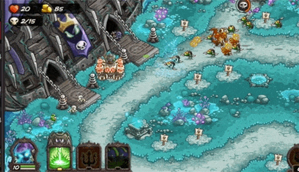 如:老城回廊这场战役,敌军会从上下两路进攻我方阵地,且前期的杂兵数量较多。所以在前期经济不充裕的情况,优先在T字路口建立两个炮台保证输出,利用英雄维鲁克的英雄技能与呆头鹅组成初期拦截攻势,就能顺利发育到后期。