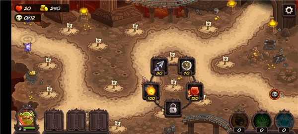 2、而游戏做出的最大改变莫过于炮塔系统的改变,原先的炮塔是固定的4个类型:箭塔、兵营、魔法塔、火炮。这4个炮塔可以根据局势在局内升级,并有两个“转职”的方向,可以选择升级到对应的炮塔形态。而新作中则是增加了一个炮塔位,我们一共可以自由选择携带5个类型炮塔进入关卡。