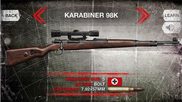 3、karabiner 98k(98k毛瑟步枪)游戏里面可以加瞄准镜和上刺刀