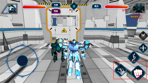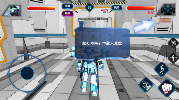 游戏中玩家需要通过拖动摇杆来控制角色来进行移动,通过点击游戏右下角的跳跃按钮来进行跳跃,通过右下角的技能按钮和攻击按钮来进行攻击,玩家还可以点击游戏右下角的变身按钮来进行变换形态,变换形态后可以提升自身移动速度。变形钢铁蜘蛛游戏内玩家还可以在游戏的右上角来查看关卡中的敌人数量,游戏右上角可以查看玩家当前的生命值,当生命值耗尽时任务就会失败,当玩家将所有的敌人击败后即可闯关成功,玩家可以点击下一关来进行闯关。还在等什么,有兴趣的玩家快来下载变形钢铁蜘蛛游戏进行闯关吧!