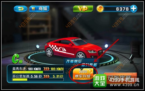 1.首先进入游戏前,先把赛车提升一下等级(由于前面几关的积累,虽然换不起车,但升级一下还是够的)。