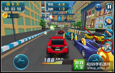 3.上面两个步骤,大家应该都知道,下面就就是两个重点。一开始,我们就先用一下加速,尽早领先对手,因为如果一开始落后,就凭我们那破到掉渣的赛车是很难追上的,再加上前面如果车多了,道路拥挤就更难了追了。