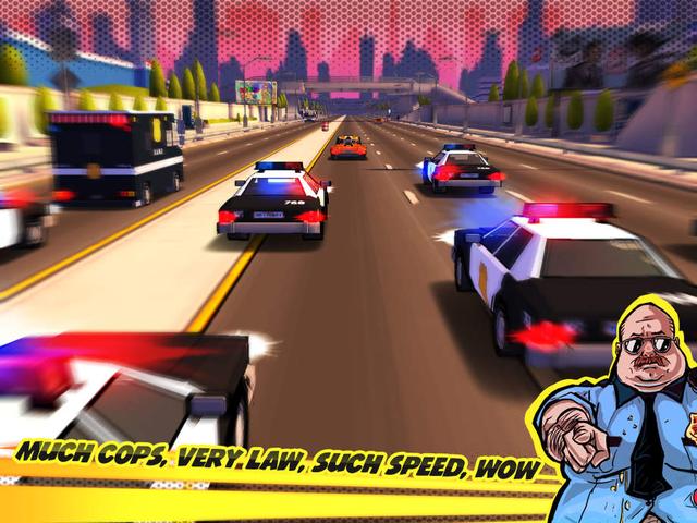 最后要说的是游戏的操作与同类型作品一样,非常简单易上手,控制赛车左右闪躲并且收集沿途的道具,然后就等着享受各种轰炸眼球的特效吧。如果你喜欢复古风格的赛车,如果你想体验在警车疯狂追击下的亡命时刻,那就值得体验一下这款新作哦。